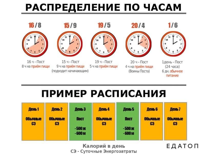 Начнем с того, что основа интервального голодания заключается в установлении границ приема пищи и голодания. Как правило в интервальном голодании есть разные промежутки приема пищи. Например, 3 часа еды, 21 час голодания; 6 часов еды, 18 часов голодания и так далее как указано на изображении выше. Хочу уточнить о том, что во время голодания можно пить только воду и все. И никто в этой диете не рассказывает о том, что есть все подряд тоже не следует. Так как организм находясь в стрессе будет -откладывать еду. У сумоистов есть диета для набирания веса. Так вот суть в этой диете есть 1 раз в день. Интересно правда? Так вот, хочу отдельно разобрать минусы при интервальном голодании от 4 часов питания и меньше, особенно хочу занести сюда режим: день через день (день питаемся как обычно, другой день только вода) Давно уже доказано, что людям с повышенной кислотностью желудка, с проблемами желудка нельзя использовать такие методы. Но почему-то об этом никто не пишет. А зря. Резкое голодание