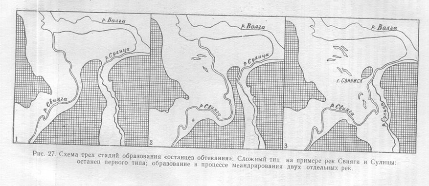 Те, кто был на острове-граде в окрестностях Казани могли бы задаться вопросом: а с чего вдруг образовался холм, при наполнении водохранилища ставший островом? Почему вдруг вокруг него низины, а он выступает над ними? Нет ли тут мистики, противоестественного? Да вот нет! Свияжск - останец. Это означает, что когда-то текло две реки, каждая из которых "подъедала" берег с двух сторон, а потом они соединились, и одна река захватила русло другой, а то, что они вместе "недоразмыли" и осталось останцем. На этой схеме видно, что когда-то Свияга текла к западу от острова Свияжска, где теперь, как говорят "течет Щука", но Щука - это просто старые протоки, а не большая полноценная река. Да и теперь это просто пролив между Свияжском и ближайшими островами. Свияга постепенно подъедала "перемычку", и "доела" ее чуть южнее нынешнего Свияжска, и захватила русло Сулицы.