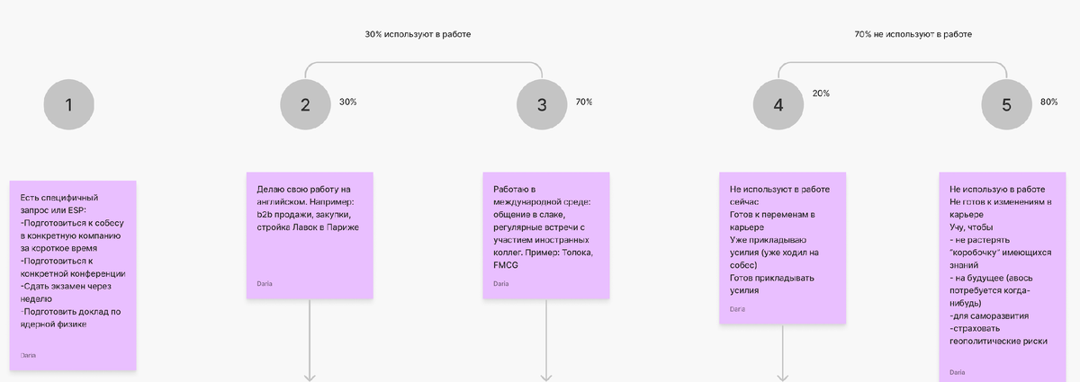 Внутри команды мы договорились, что новый продукт будет нацелен на аудиторию, кто уже знает английский на среднем уровне и хочет продолжать учить английский дальше. Для начинающих уже был отдельный продукт и мы не шли в эту сторону. В итоге у нас получилось выделить 5 сегментов ЦА с уровнем Intermediate и оооочень примерно оценить их размер. Подсвечу, что к этой оценке было много справедливых вопросов внутри команды. Она не отражает рынок, тут есть большая погрешность, но этого было достаточно, чтобы в полной неизвестности сориентироваться, сформировать гипотезы для дальнейшей проверки. По-хорошему, нужно было бы заказать исследование на аутсорсе, но у нас не было много времени и денег. Поэтому прикинули объём по полученным данным и погнали дальше 😅🥲😃