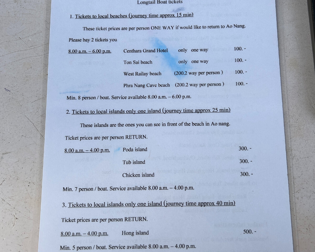 Раньше я думала, что за шикарными пляжами, с голубой водой и белым песком надо непременно ехать куда-то в малолюдные места, желательно подальше от цивилизации, поближе к дикой природе. Так тоже можно, но это необязательно. Сегодня я посетила пляж, который в моём сердце занял главное место. Я нахожусь сейчас в провинции Краби, в Таиланде. Этот регион славится красивыми островами, как с открытки. Здесь много туристических компаний, которые предлагают отвезти на лодке на соседние острова и пляжи, до которых можно добраться только по воде. Сюда входит только трансфер туда и обратно при необходимости, потому что на некоторых пляжах или островах можно остаться на несколько дней. А есть морские туры на целый день с посещением сразу нескольких островов. Ниже фото цен в одной из компаний (цены везде идентичные): Пляж Ао Нанг, рядом с которым мы жили, был уже неплохой, но мы решили доплыть до соседнего пляжа Рейли. До него можно добраться только по воде, а плыть всего 15 мин. За лодку заплатили