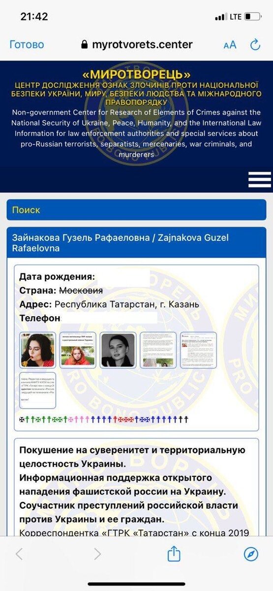 Ведущая ГТРК «Татарстан» Гузель Зайнакова попала в список скандально известного украинского сайта «Миротворец». Он публикует данные журналистов, чья позиция противоречит официальным киевским властям. Имя и личные данные журналистки были опубликованы на сайте из-за создания телевизионного проекта «Голос Луганска» — серии интервью с жителями Луганска, которые 8 лет жили под обстрелами со стороны западной Украины и постоянной угрозой смерти. В карточке указано, что журналист ГТРК «Татарстан» включена в список из-за «покушения на суверенитет и территориальную целостность Украины», «информационную поддержку нападения России на Украину» и соучастие в «преступлениях российской власти против Украины и ее граждан».