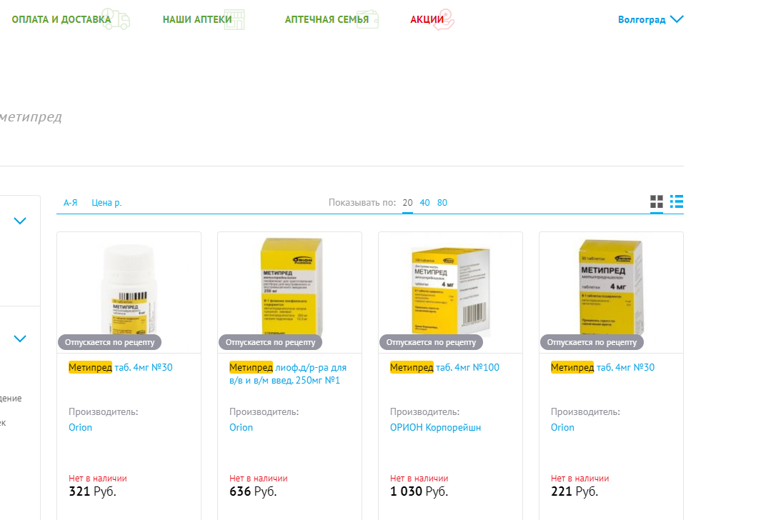 Жители Волгограда жалуются на исчезновение жизненно важного препарата «Метипред» из аптек. В редакцию «Блокнота» обратилась жительница Спартановки. Она рассказала, что с просьбой заказать препарат к ней обратилась родственница, которая страдает серьезным аутоимунным заболеванием — пожилая женщина не владеет интернетом, а очные визиты в аптеку результата не принесли — назначенного ей врачом «Метипреда» нигде не было. Так как препарат продается по рецепту, волгоградка предложила родственнице заказать его на удобный адрес, где женщина сама приобретет его. Каково же было удивление, когда ни на одном из доступных онлайн-сервисов желаемого «Метипреда» не оказалось. Не смогла волгоградка найти его и в других городах. При этом линейка показаний для препарата достаточно обширна: это системные заболевания соединительной ткани, различные виды артритов, острые и хронические воспалительные заболевания суставов, эндокринные заболевания, волчанка, аллергические состояния, офтальмологические недуги, з