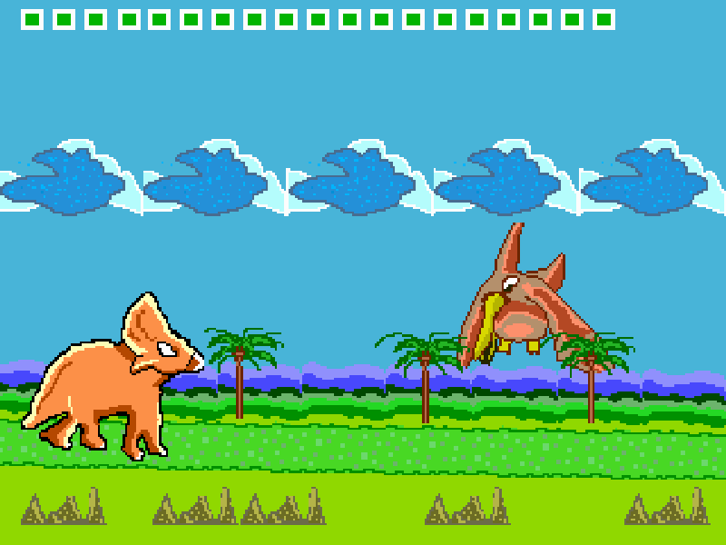 Птеродактиль его уже встречает. Но дело в том, что птеродактиль умеет летать и облетать препятствия. А динозаврику придется идти и прыгать. Перепрыгивать через препятствия.