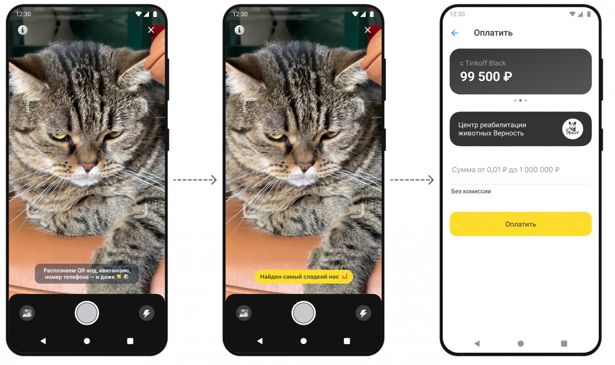«Тинькофф» разработал и запустил умную финансовую камеру. Она способна распознавать разные предметы и объекты: от финансовой информации до живых существ, например собак и кошек, и делать пожертвования в фонды помощи бездомным животным. Чтобы воспользоваться камерой, нужно перейти в приложении в «Платежи», нажать на значок сканера в верхнем правом углу, навести камеру на объект и совершить действие. В будущем она появится на главном экране. Умная камера объединяет в себе технологии компьютерного зрения и обработки естественного языка. Что умеет умная камера в стартовой версии: В ближайших планах развития Умной камеры: Камера обучена распознавать сложные объекты. На первом этапе она умеет определять кошек и собак, попавших в объектив. Например, при наведении на животное можно перевести деньги в благотворительный фонд помощи бездомным животным. Они будут выпадать пользователям случайным образом. В ближайшем будущем камера сможет распознавать людей, автомобили, а также другие сложные движу