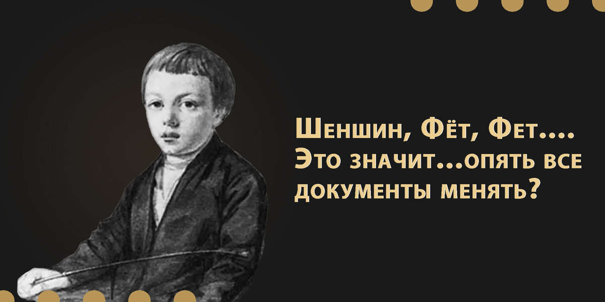В 14 лет мальчика решают отдать в школу, но при проверке документов выясняется что, тот незаконнорожденный - брак по православным обычаям отец и мать оформили уже после появления мальчика на свет. Из-за этого маленького Афанасия лишили дворянских прав, присвоили ему фамилию матери Фёт и отправили учиться в частный пансион в Эстонии. Сам Афанасий всю жизнь настаивал, что его биологический отец - Шеншин, а фамилию изменил с Фёт на Фет.