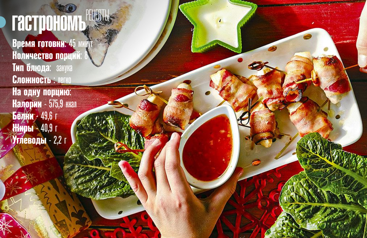 Рулетики из индейки в беконе – твист на популярное итальянское блюдо сальтимбокка («прыгни в рот») из нежирной свинины, телятины или индейки с прошутто и шалфеем. Кстати, и в этом рецепте листик шалфея в середине рулетиков не будет лишним. Такие рулетики можно запечь в духовке, как в нашем рецепте, или обжарить на сковороде. Это блюдо выглядит очень нарядно, ему подойдет и роль горячего на праздничном столе, и главная партия среди закусок в фуршетном формате. Ингредиенты Пошаговый рецепт приготовления Шаг 1 Смешайте в миске растительное масло, лимонный сок и кисло-сладкий соус, взбейте вилкой до однородности. Шаг 2 Нарежьте филе индейки кусочками размером 4 х 1,5 х 1,5 см. Положите в полиэтиленовый пакет. Залейте маринадом, немного посолите и хорошо потрясите. Оставьте на 1 ч в холодильнике, периодически переворачивая пакет. Шаг 3 Разрежьте бекон на полоски длиной 8–9 см. Оберните бекон вокруг кусочков индейки и закрепите шпажками. Подпишитесь на рассылку рецептов и советов Подписаться