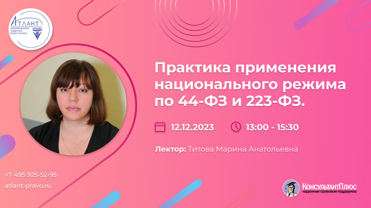 или Практика применения национального режима по 44-ФЗ и 223-ФЗ Иногда бывает очень сложно разобраться во всех нюансах того или иного закона. Так и хочется сказать “А можно всё это разобрать на конкретных примерах”? Можно. Для этого у нас с вами есть административная и судебная практика. И это отличный инструмент для того, чтобы понять, какие ситуации чаще становятся предметом разбирательств и на чьей стороне, скорее всего, будет суд. По национальному режиму накопилось очень много вопросов. Именно поэтому мы пригласили Титову Марину Анатольевну провести для вас специальный вебинар на эту тему. Вебинар «Практика применения национального режима по 44-ФЗ и 223-ФЗ.» состоится 12 декабря 2023 года. Рассмотрим: Практику применения национального режима по 44-ФЗ: ● применение постановления Правительства РФ от 10.07.2019 N 878; ● применение постановления Правительства РФ от 16.11.2015 № 1236; ● применение приказа Минфина России от 04.06.2018 N 126н; ● применение национального режима при исполнен