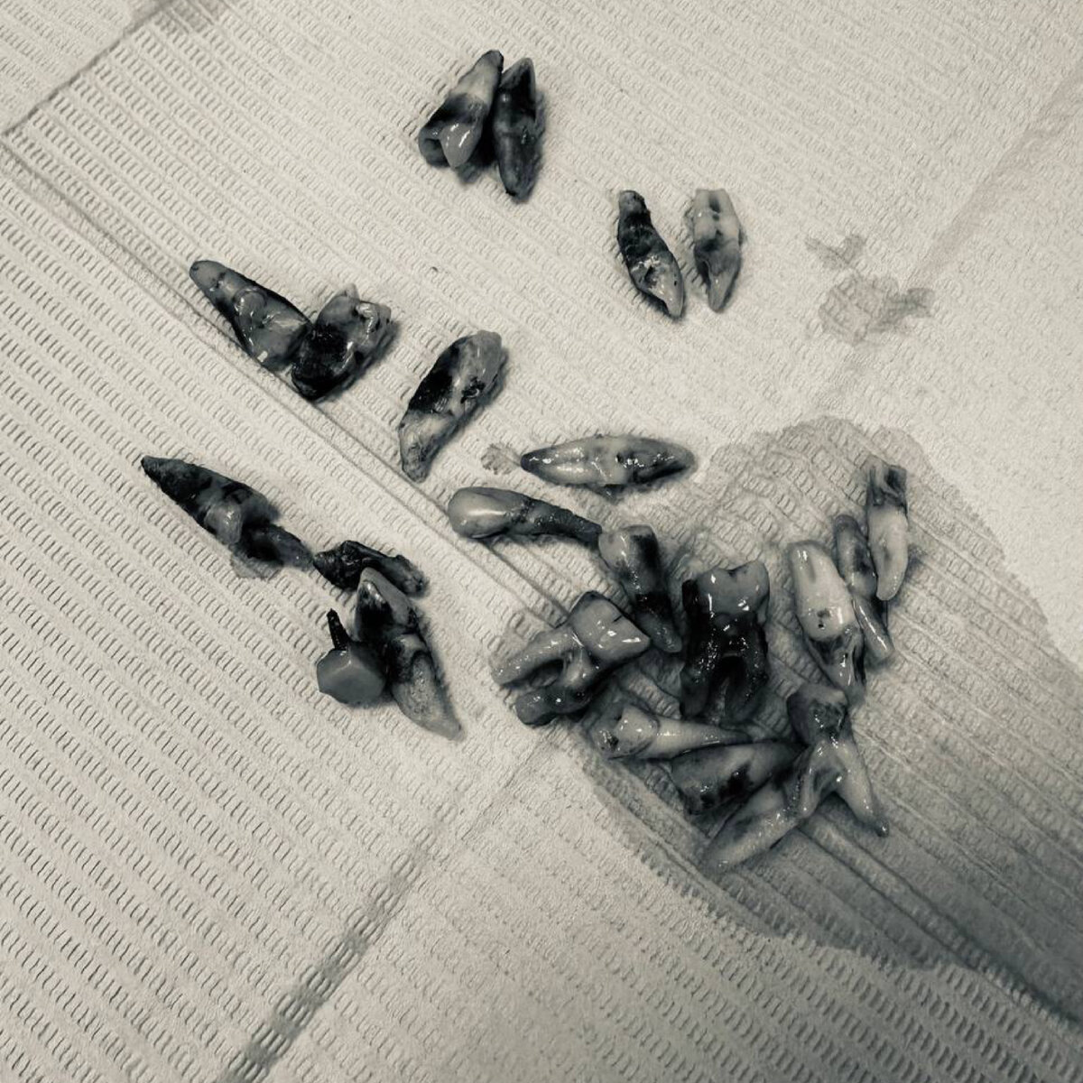 На снимке зубы, которые мы вынуждены были удалить пациенту за один визит. А дело в том, что всё это великолепие само практически выпрыгивало нам в руки. И такая жуткая для человека далёкого от стоматологии картина ー результат пародонтита, болезни, способной унести кучу зубов даже без кариеса.