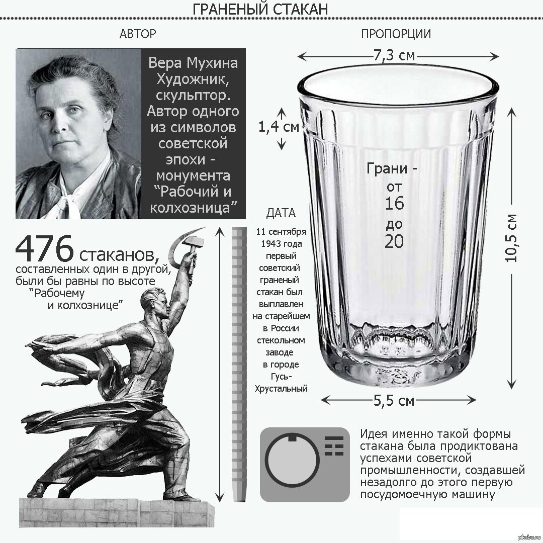 Внимание — многие свидетели советской жизни воспринимают гипотезу про Веру Мухину как миф и легенду. И что на самом деле первые гранёные стаканы появились чуть ли не в 1925 г. Тогда как Мухина всего лишь видоизменила их.