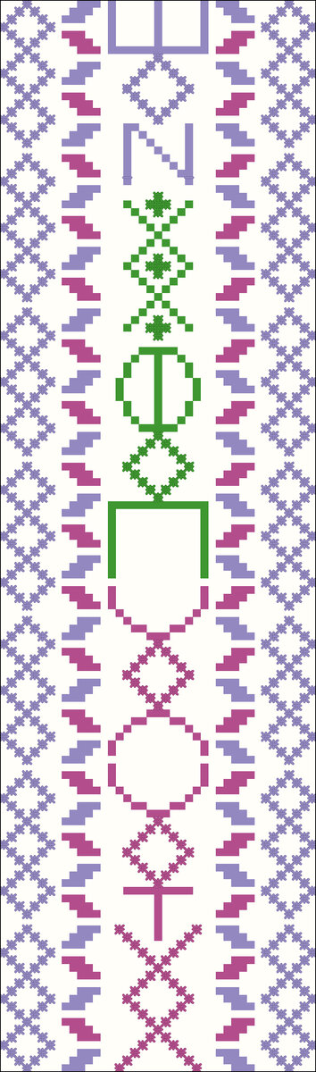 Обережная схема Обережная схема - закладка для книг. Схема простая, планируемый размер вышивки 7,5 на 25 см. Вертикально по всей длине закладки расположены следующие Руны по бокам – Ключ, и идем снизу вверх – Защита, Легкость, Путь (считается, что если эту Руну рисовать детям, они будут лучше учиться), поднимаемся выше – Рост, Веденье и Дезинформация. Руническая формула – легкое безопасное усвоение важной и нужной информации. Юлия.