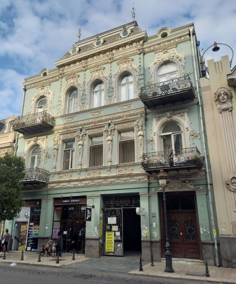 Начнем нашу виртуальную экскурсию по Тбилиси на том же месте, где закончились предыдущую. Статья, посвященная тбилисским зданиям, фасады которых украшают скульптуры атлантов, вышла более года назад, и вот мы снова на проспекте Агмашенебели (бывшая Михайловская улица), пожалуй, самой европейской и благоустроенной улице грузинской столицы. А путь наш лежит к дому под номером 93, в начале XX века принадлежавшему крупному тбилисскому торговцу рыбой Цкалобе Абазову, чье имя переводится с грузинского как «благотворитель».
