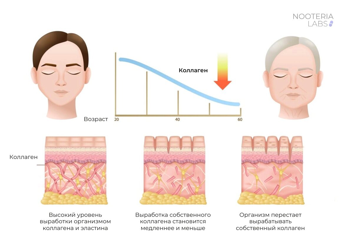 Однако в возрасте 25 лет выработка коллагена замедляется, в результате чего содержание вещества в организме, особенно в коже, снижается на 1,5% в год.