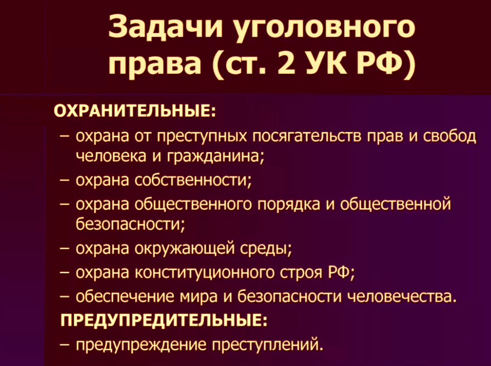 1. Задачами настоящего Кодекса являются: охрана прав и свобод человека и гражданина, собственности, общественного порядка и общественной безопасности, окружающей среды, конституционного строя Российской Федерации от преступных посягательств, обеспечение мира и безопасности человечества, а также предупреждение преступлений.