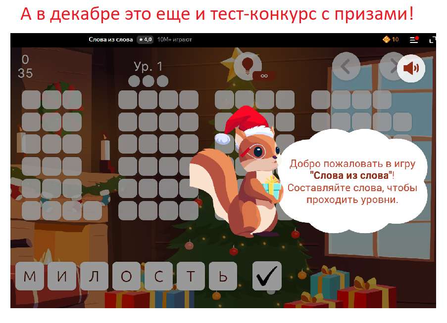 Что нам - психологам-тестологам - не хватает в играх типа "Слова из слова"? - Не хватает информации о том, какое место занял человек со своим результатом по сравнении с другими участниками игры, то есть насколько развит его вербальный интеллект. Поэтому мы решили в декабре провести в нашем онлайн-клубе КИТТ тест-конкурс с призами на базе этой игры. Есть такая гипотеза, что кому-то БУДЕТ ИНТЕРЕСНО ПОУЧАСТВОВАТЬ просто под олимпийским девизом "Главное - не победа, а участие!" - тому, кто хотел бы сравнить себя с другими и не обязательно выиграть приз, но узнать свое место на таком конкурсе, кто хотел бы измерить свой собственный вербальный интеллект. Мы в клубе КИТТ всех участников снабжаем информацией о занятом месте. Каждый видит свой номер в списке личных номеров, упорядоченных в порядке занятых мест.