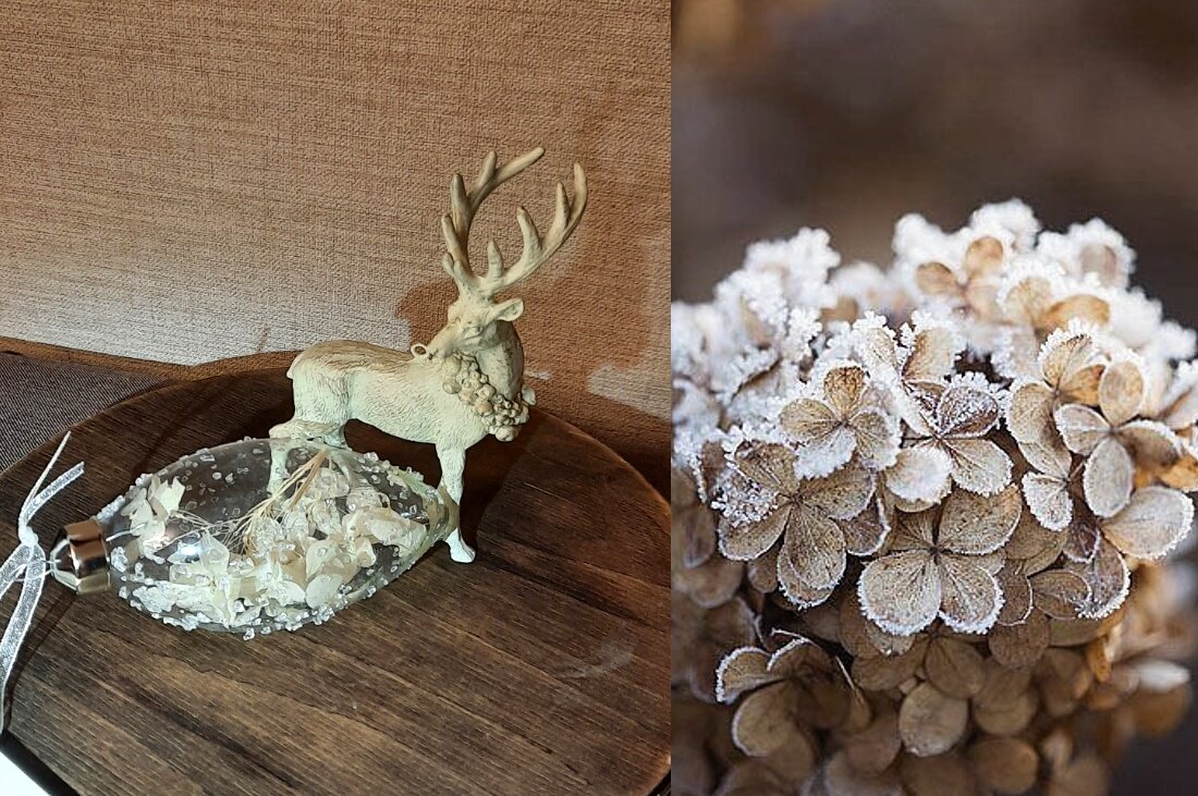 На первом снимке наши покупки из Ашана. Олень и прозрачные капли-шары с гортензией внутри.