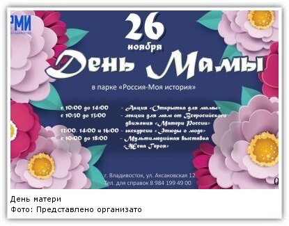 — С 10:30 до 13:00 на 4 этаже парка пройдут образовательные лекции для мам от Приморского отделения Всероссийского движения "Матери России". В программе: общение, чаепитие и детская игровая зона.