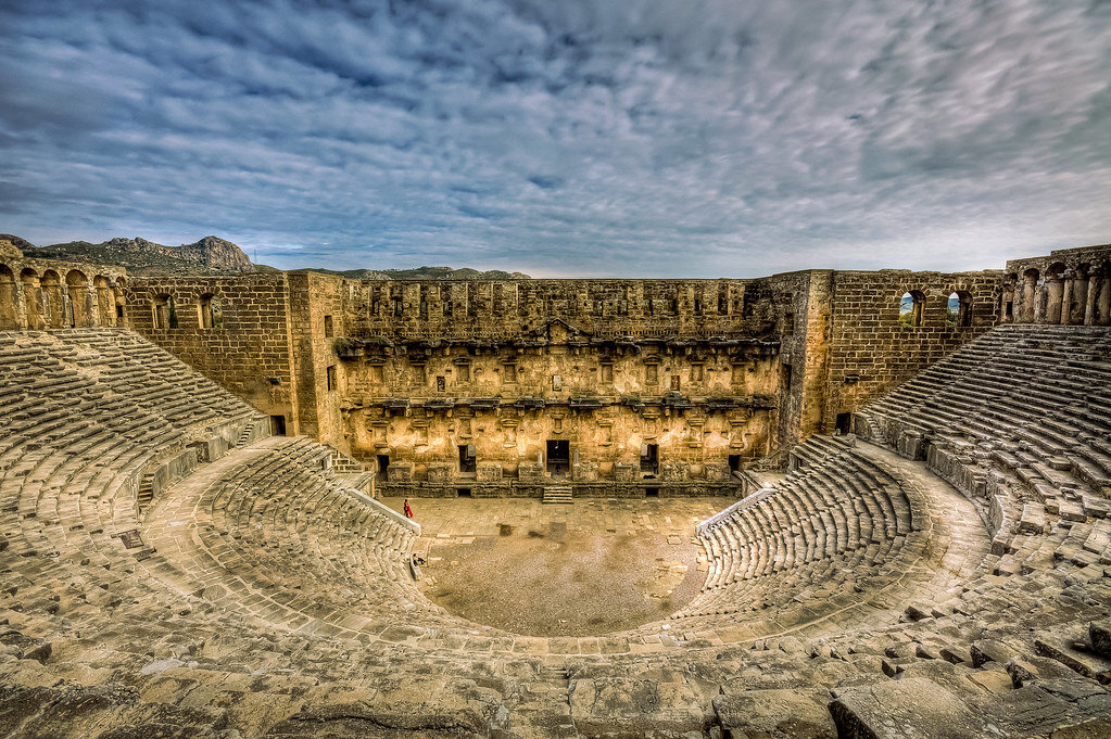 Этот древний театр расположен недалеко от Анталии в районе Белек и является впечатляющим свидетелем античной эпохи. Театр был построен во 2 веке н.э. и вмещал около 15 000 зрителей. Уникален он тем, что до сегодняшнего дня он среди многих других сохранился максимально и почти не претерпел разрушений за столь длительное время существования.