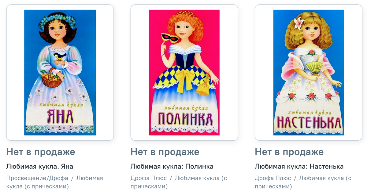 В начале двухтысячных годов художник Галанова Татьяна Вячеславовна нарисовала для издательства Дрофа/Просвещение четырёх куколок -- трёх девочек (блондинку, рыжую и брюнетку), и одного мальчика (чтобы он был как турецкий султан и имел трёх жён): Куколок потом выпускали под разными именами, девочек -- в серии "Любимая кукла", мальчиков -- в серии "Лучший друг". Потом другой художник нарисовал для "Любимой куклы" ещё одну блондинку, платиновую, а кавалер так и остался один на всех: У нас в гостях сегодня Сашенька, она же Вероника, Кристина, и Яна. Одна женщина написала в рецензии к этой серии, что купила внуку кукол с разными именами, не посмотрев содержание книжек, чтобы он на дне рождения подарил каждой подружке книжку с её именем. А потом оказалось, что куклы там одинаковые. Она расстроилась, но вот мне один устроитель утренников сказал, что это наоборот самый лучший вариант: История с утренником такая -- аниматор делал детям какого-то зверя из длинного тонкого надувного шарика, из та