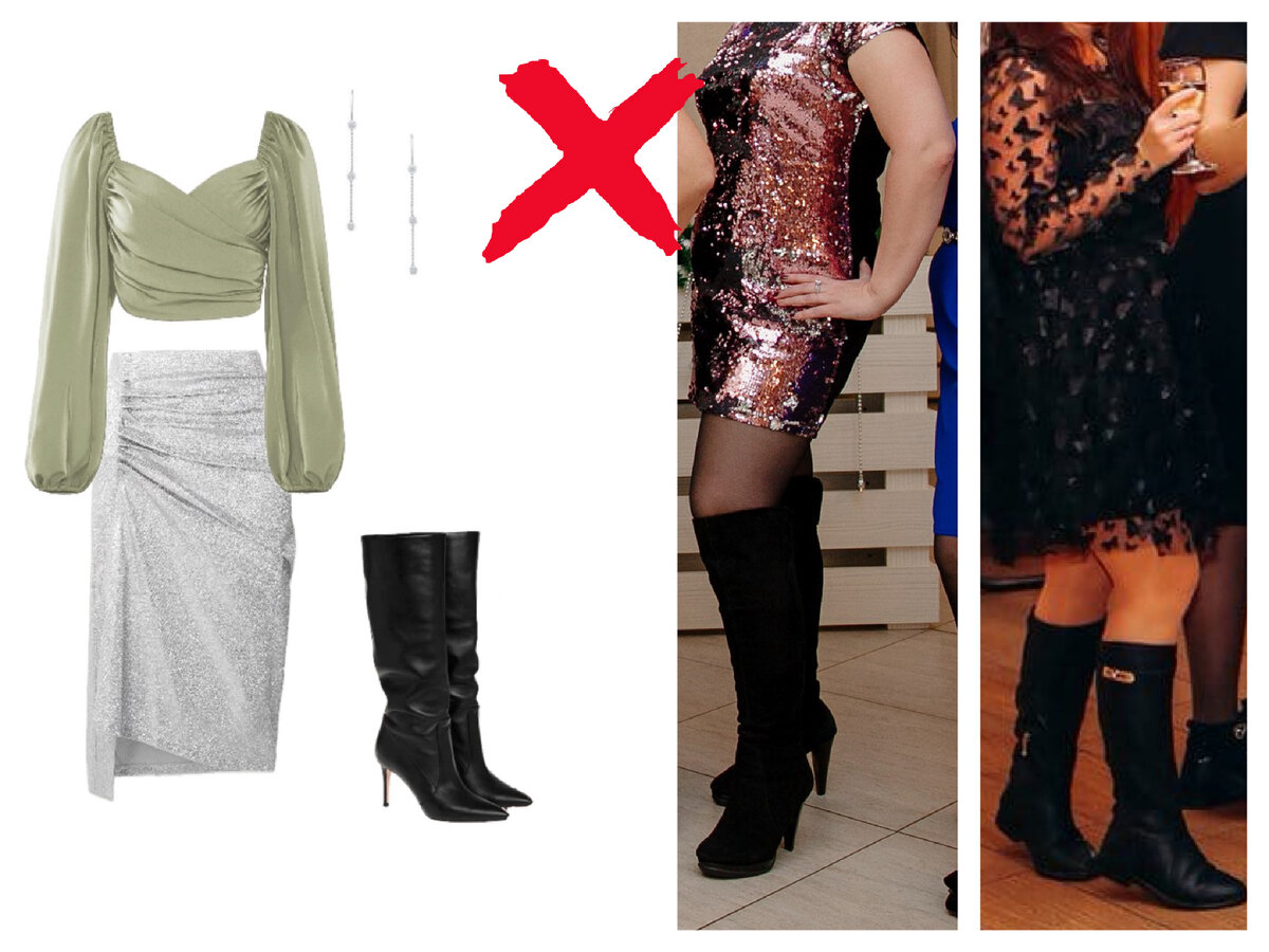 Привет! Хочу поговорить про общие ошибки, которые иногда совершают при выборе образа на новогодний корпоратив. 1). Чёрные сапоги Одна из распространённых практик — чёрные сапоги под любой наряд. Бывают образы, когда такая деталь вписывается в общий стиль. Их можно надевать, к примеру, с тёплыми платьями, юбками плотной фактуры и плечевыми изделиями с длинным рукавом. Сапоги не надевают, если одежда: Если в помещении жарко, если это ресторан или кафе — возьмите с собой туфли. 2). Чёрная обувь и чёрные колготки в светлых образах Когда мы выбираем светлый наряд, необходимо продумать с чем его сочетать. Часто тёмный низ не вписывается в общую концепцию. Поэтому вместо чёрных колготок можно выбрать коричневые, светло-коричневые, белые/бежевые. Вместо тёмной обуви — варианты светлее. Так ваш образ будет целостнее и не будет разделён на цветовые блоки (не добавит визуальных кг, не снизит рост и тд). 3). Устаревшая одежда Неактуальный фасон + неактуальные аксессуары + неактуальная обувь.