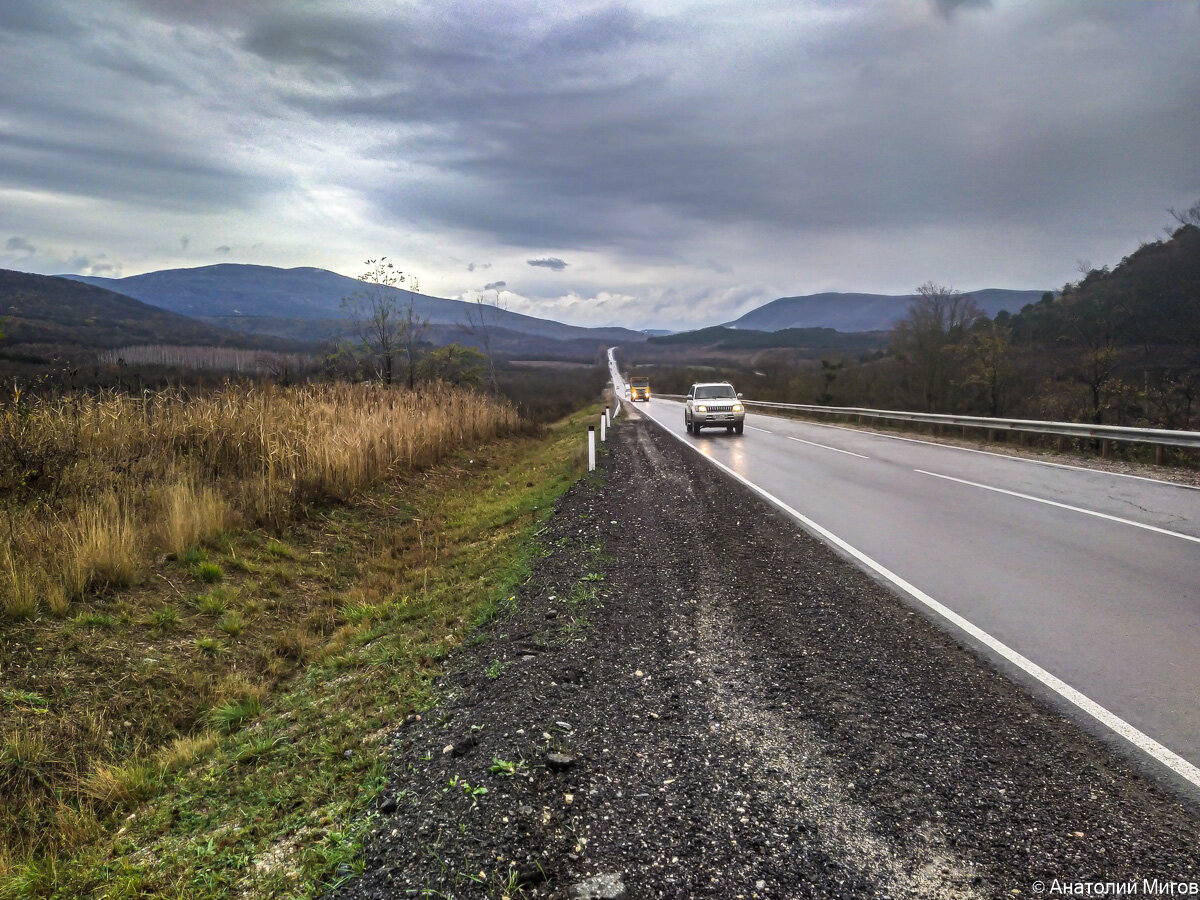 Ездил в православный женский монастырь за хлебушком, вчера рассказывал про эту поездку. От нашего дома в Старом Крыму до села Тополевка, где находится монастырь, 20 км. Ехать в сторону Симферополя, не по Тавриде, а по старой дороге. По дороге я немного пофотографировал. Сейчас покажу как выглядит наш кусочек Восточного Крыма в конце ноября. Хуже погоды не бывает, но всё равно красиво, как ни крути. Небо серое, тяжёлое, вот-вот упадёт на дорогу. Дорога идет вдоль долины, справа-слева горы. Основной поток машин идёт по Тавриде, но и здесь немало автомобилей. Лично я больше люблю ездить по этой старой дороге. Она красива в любое время года. В районе Белогорска она вливается в Тавриду и дальше до Симферополя идёт только одна автодорога. Миновав село Грушевка, уже можно увидеть Топловский монастырь. Маковки Свято-Троицкого собора и колокольни возвышаются над горой слева от дороги. Чтобы попасть в монастырь, надо свернуть с дороги по указателям. Дорога к монастырю живописная, извилистая и