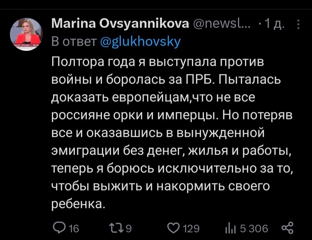 Тяжела и неказиста жизнь предателя Родины. Собственно, бывший редактор Первого канала Марина Овсянникова, получившая свои "пять минут славы" после того, как ворвалась в эфир вечерних новостей на Первом канале с антивоенным плакатом наперевес, на собственном опыте прочувствовала всю правоту этого высказывания. Светочу "проукраинской правды" Марине Овсянниковой теперь только и остается, что жаловаться на свою тяжелую долю в социальных сетях. Пять минут славы прошли и за границей Марина оказалась никому не нужна. И на Родину уже не вернуться. Родительских прав лишена, в России ждёт срок. Как журналистке, по всей видимости, оказалась не самой востребованной. После трехмесячной стажировки немецкие руководители в своем издании ее оставлять отказались. А новых вакансий, судя по всему, никто так и не предложил. "Для рупора оппозиции малоумна, а ручками работать не привыкла. И самое главное... предавать теперь некого", - комментируют страдальческие публикации Овсянниковой в Сети. "Когда