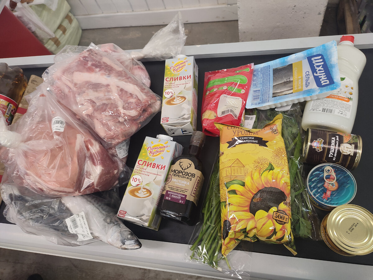 А теперь начинаю свой обзор покупок, на снимке что вверху большой кусок мяса. Жена выбрала лопатку... за что ей очень благодарен. Отличное мясо...часть уже запекли, пару маленьких костяшек ушли на борщ, из остального сделаем фарш)