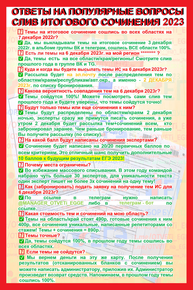 6 декабря 2023г пройдет итоговое сочинение, подготовиться по темам можно из открытого банка заданий. Темы по областям известны заранее. Готовые сочинения можно найти в Интернете (аргументы, заключение и т.д.) Итоговое сочинение - это важный этап в жизни учеников, который определяет их будущее. Успех на экзаменах зависит от подготовки и стратегии, которую выбирает каждый учащийся. В этой статье мы рассмотрим ключевые сливы и стратегии, которые помогут ученикам получить максимальное количество баллов. https://t.me/otveti_ege