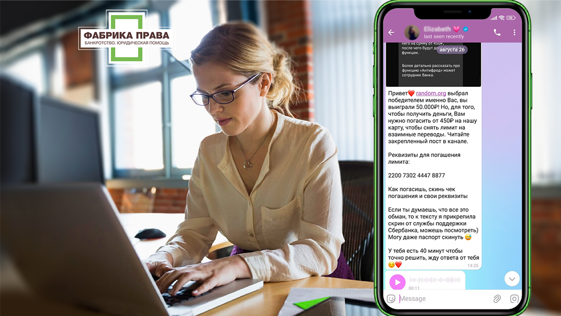 Одна наша сотрудница была подписана на один канал с товарами с одного известного маркетплейса. Вдруг ей пришло оповещение от этого канала, что она участвовала в розыгрыше 50 000 рублей и победила. Но для того, чтобы за ней закрепился денежный приз, ей нужно ответить в течение 10 мин, иначе победа в розыгрыше перейдет другому участнику.