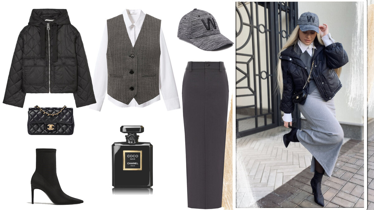 Итак, совсем недавно я прогуливалась в таком луке. Шпилька, конечно, не подразумевает выход на гололед. Головной убор выбрала такой, так как очень люблю кепки и наличие капюшона - немаловажно. Сейчас вместе, еще раз, посмотрим на классный и модный образ, а далее я вам расскажу как его преобразить в зимний вариант. В своем выпуске о покупках на сезон я уже говорила про эту юбку, о которой так часто меня спрашивают (название бренда в конце, цена вас очень удивит). Она выполнена из тонкого материала, хотя ткань совсем не рыхлая, скрывает мои недостатки и в нужных местах подчеркивает фигуру - брала на несколько размеров больше своего. Если у вас есть животик, то юбка может его подчеркнуть, но, выбрав в комплект свитшот, кардиган или пуловер пообъемней и до середины бедра, вы сможете визуально решить этот вопрос. Под низ юбки необходимо подобрать плотные колготки с большим содержанием шерсти или кашемира (только не телесного цвета). Кепку я заменила на серую шапку, а ботильоны на ботинки Че