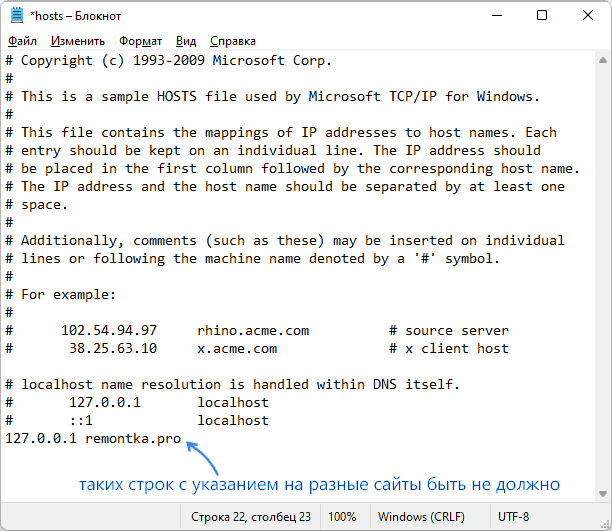 Достаточно будет удалить все строки, которые начинаются не со значка решетки (впрочем, можно просто удалить всё содержимое файла hosts — результат будет тот же самым), затем сохранить файл и посмотреть, была ли решена проблема с открытием нужных сайтов. Также может помочь отключение брандмауэра в Windows, в котором могут быть настроены правила блокировки сайтов.
