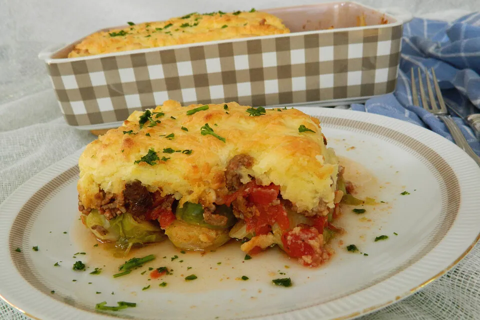 У меня брюссельская капуста тосковала в морозилке, и все до нее руки не доходили. Да и аккомпанемента к ней подходящего все не попадалось, да не попадалось. Но знакомые, заявив, что они такое готовить боятся, а я – экспериментатор, подкинули рецепт брюссельской капусты «по-гречески», сказали – если не помру, то сами попробуют, а то уж очень дикое сочетание ингредиентов. Итак, заинтриговал? Тогда берем: Как готовим: Картофель варим до состояния, когда из него можно сделать хорошее пюре. Брюссельскую капусту отвариваем в кипящей подсоленной воде минут десять, не больше. Можем разрезать ее на половинки. Лук нарезаем на кубики, обжариваем, добавляем фарш и жарим все вместе до рассыпчатого состояния. Добавляем очищенные и нарубленные томаты в собственном соку, вместе с жидкостью. И вот на этом этапе забрасываем изюм. Заодно солим, перчим, добавляем корицу. Картофель разминаем с молоком, даем остыть, вбиваем в него яйца. Солим. Выкладываем в форму слоями – сначала капусту, потом фарш, потом