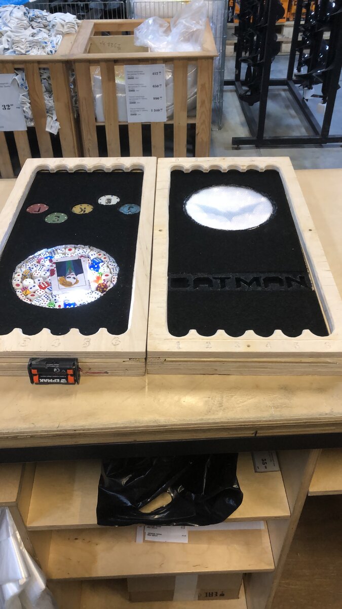 На работе нашелся ,,ненужный’’ лист фанеры и тут понеслась… Только появлялась необходимость в каком либо инструменте, например в паяльнике или выжигателе по дереву, шел и покупал. Таким манером мой инструментарий пополнился, ассортимент начинался с пера по дереву на 25мм, до гравера и лобзика. Подготовить доски было первой задачей, сложность была в пайке и обдумыванию всех этапов поскольку они должны включать подсветку при открытии. Одна сторона и наружняя и внутренняя представляет сторону джокера выполнена из пластиковой карты с джокером (Хита Лэджера конечно же) электродиодов и множества кубиков надпись джокер выполнена из фишек для игры в покер. противоположная сторона бэтмена выполнена в виде прожектора бэтмена От идеи с эпоксидной смолой пришлось отказаться и добавлять слой для вставки стекла. Наружние стороны выполнены в виде девушек бэтгёрл и харли квин. фишки разработал и напечатал на 3д принтере.