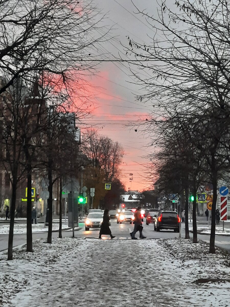А небо выдало розовый оттенок. Где-то там садится солнце, и его лучи, пробиваясь, раскрашивают сплошные облака. На склон не ходила, снега все же много, да и скользко.