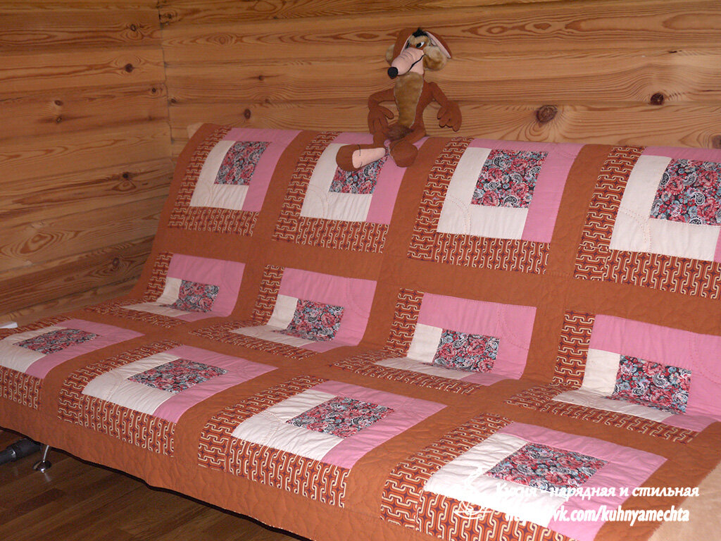 Я уже не помню, как я познакомилась с этим видом творчества. Но это было волшебство. Из цветных лоскутков создавать потрясающие вещи это мне казалось высшим пилотажем. Здравствуйте, дорогие читатели. Меня зовут Марина, мне 62 года и я очень люблю заниматься рукоделием. Пэчворк это ещё одно моё увлечение. Как жаль, что у человека всего 2 руки и в сутках только 24 часа. Так много хочется успеть сделать, смастерить. Я никогда не любила мелкие работы, если уж вязать, так платье или джемпер, а если пэчворк, то покрывало, не меньше. Такая у меня натура, не люблю тратить время и силы на мелочи. Училась понимать что такое пэчворк я на небольшой подушке для собак. Сделала из каких-то обрезков, лоскутков. Потом сразу замахнулась на покрывало, у меня как раз нечем было диван застелить. Пошла в магазин тканей и купила разноцветную бязь. Честно вам скажу, не представляла, что может получиться. Вот такой была моя самая первая работа. Стёжку делала вручную, так как моя прежняя машинка не справлялась