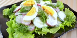 Смешиваем в глубокой таре ингредиенты, в том числе очищенные от скорлупы яйца, разделенные на небольшие дольки. Рвем листья салата на небольшие кусочки(кладем на дно тарелки целые листья),и посыпаем укропом.