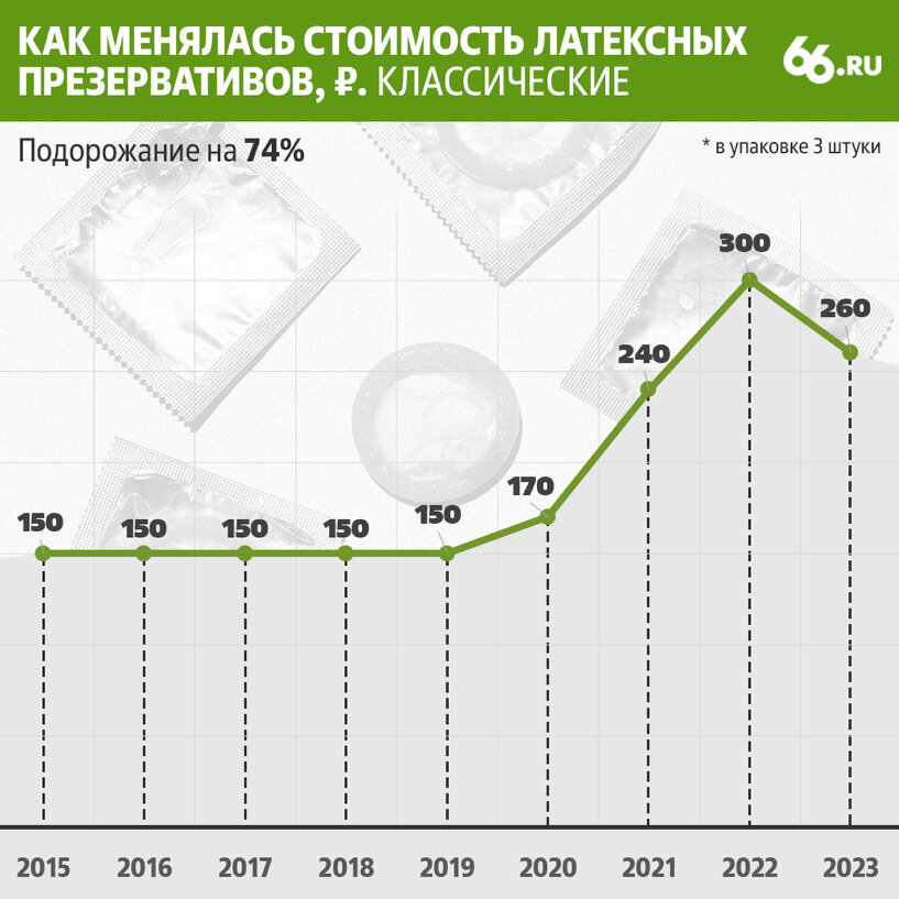 Магазин товаров для здоровья «Казанова 69» по просьбе 66.RU предоставил информацию о том, как менялась цена на презервативы на протяжении последних нескольких лет. Еще девять лет назад классические латексные презервативы Vitalis немецкого производителя стоили 150 рублей за упаковку из трех штук. Эта цена оставалась неизменной до наступления нового десятилетия. В 2022 году контрацептивы подорожали на 100%, в 2023-м подешевели, но незначительно. Полиуретановые презервативы гораздо дороже, чем латексные. Японский бренд Sagami производит одни из самых тонких изделий премиум-класса в мире. Упаковка Sagami Original 0.01 (5 штук в упаковке) еще несколько лет назад стоила довольно дорого. Но к 2023 году они тоже подорожали — на 30%. Значительное изменение цены можно заметить по другой версии японского бренда — Sagami Original 0.02 (6 штук в упаковке). С 2015 года их цена выросла на 170%: с 890 до 3650 рублей за упаковку. Основной фактор изменения цены — курс валюты, рассказали в «Казанове 69».