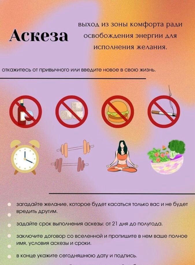 Сегодня поговорим об одной интересной практике, которая позволит человеку исполнить желания в более краткий срок, а именно об аскезе💌 ❌Аскеза- это разновидность физических и нравственных упражнений, представляющий собой добровольный отказ от чего-либо (чаще всего негативного), в целях исполнения своего желания❌ Правила аскезы: ✅ Загадай желание, которое не сбылось бы просто так; ✅ Подумай от чего ты можешь отказаться или наоборот внести в ежедневную рутину ради своего желания; ✅ Установи срок аскезы (он может быть любой, но не менее 2 недель); ✅ Не живи этим желанием, отпусти его и продолжай выполнять свой челлендж Важно: ❌Если ты всё таки не можешь отказаться от чего-либо ради своего желания (прерываешь аскезу), то это означает, что ты еще не готова к его исполнению, либо жертва несоизмерима с целью❌ С помощью аскезы мы, как бы «духовно» оплачиваем исполнение нашего желания и показываем силу вашего намерения♥️