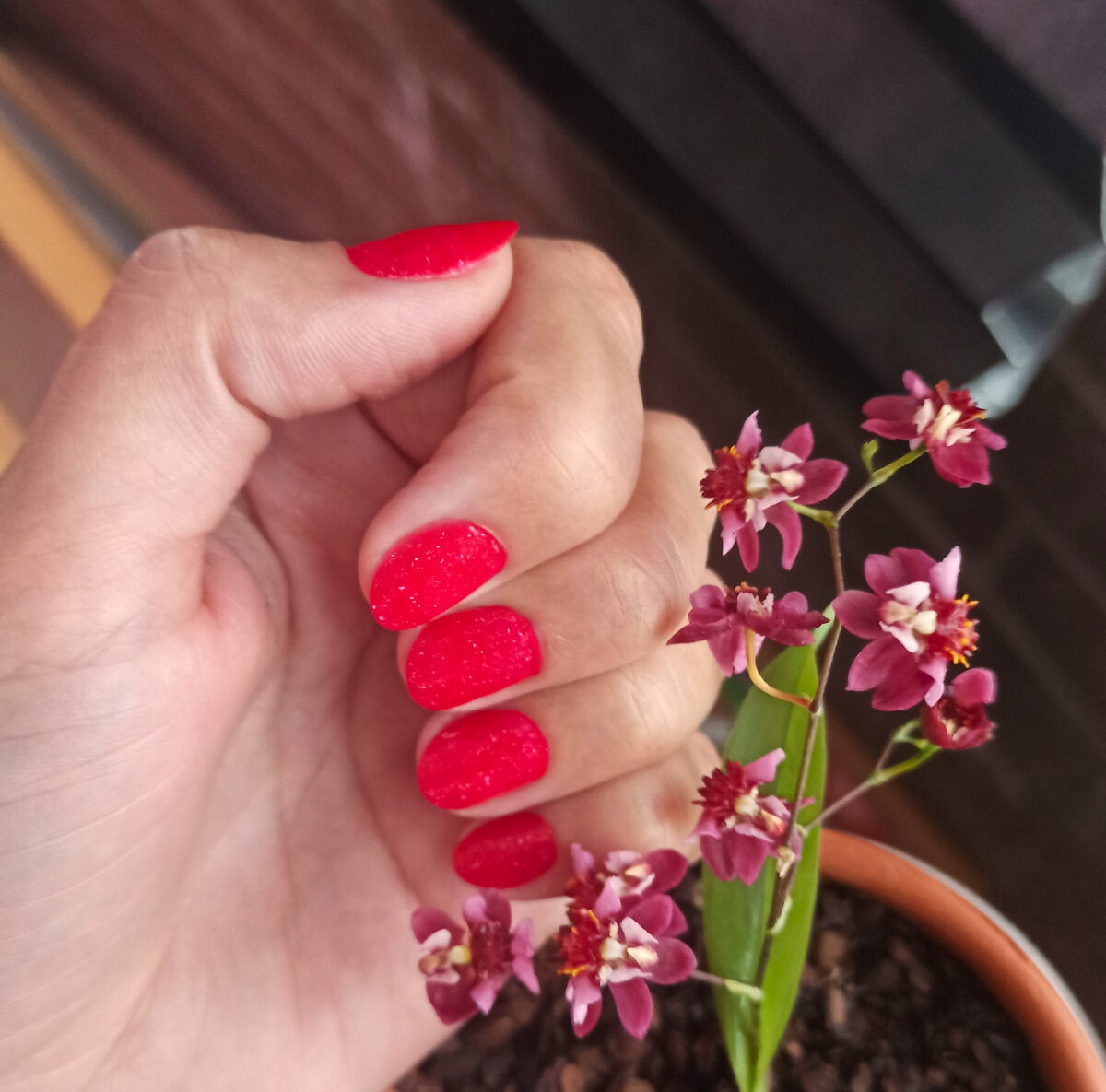 Расцвел у меня онцидиум и захотелось его запечатлеть в паре с какими-нибудь ноготками вместе. А так как до этого я делала маникюр под алые аксессуары на встречу одноклассников, то в цвет растения, конечно, не попала. Но всё равно получилось красивенько😊 Лак этот я очень люблю за простоту нанесения, желейную текстуру и нарядные искорки. Он и праздничный, и не слишком нарядный одновременно. Снимается тоже без проблем, блестки не прилипают к ногтевой пластине, пигмент не размазывается. Лаконичный и удобный в хранении квадратный флакончик тоже любим мною, как и его содержимое. Подтон лака скорее малиновый, но на моих руках смотрится тёплым оттенком. Ну и не могу налюбоваться на красавчика Oncidium Twinkle Red, который наконец-то порадовал цветочками. Его желтый собрат уже давно распустился и начал даже отцветать, а этот теперь пришёл ему на смену🌺