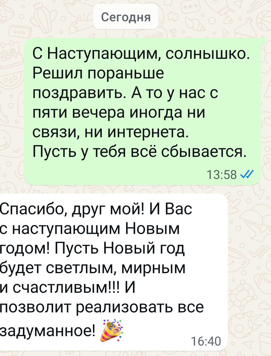 "С Рождеством тебя, заюшка. Рад, что всё у тебя хорошо. Это потому, что ТЫ ТАК ХОЧЕШЬ. И я тоже. Спасибо, что ты была и есть. Внимательней и осторожней. Целую". — Фельдшер отправил смс. Это уже много лет была их рождественская традиция.