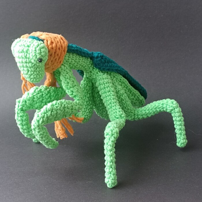 Всё просто - добавить шарфик! Пошли мы как-то с подругой и детьми на выставку насекомых. И приглянулся ей там богомол вязаный, только стоил он для неё слишком дорого, на что я и пообещала связать ей такого же. Надо было конечно хорошо подумать, но это не мой конёк. Долго я гуглила схемы и описания что есть и всё было не то. Даже думала просто купить у ребят с выставки. Пришлось рассмотреть пару сотен фоток живых богомолов (брррр) и пытаться вязать из головы. Дело шло туго, ещё и проволока бесячая, надо же, чтоб она несломалась через пять минут, а обвязать такую издевательство. Но конец таки наступил, посмотрела я на него и поняла, что не мимими. Сперва думала связать ему свитер, но таки не придумала как это сделать, чтоб можно было и снимать. Остановилась на шарфике. Хотелось ещё бы шапочку, но она закрывает эти прекрасные (бррррр) глазки. Конечно, получился парень не без косяков, я по другому не умею, в тело то я не вставила проволоку и ему тяжко держать лапки. Но подруга и ребёнок до