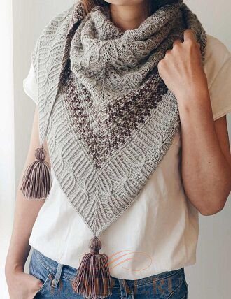 Первая зеленая асимметричная шаль выполняется от верхушки до нижнего широкого основания. Вторая шаль в бежевых тонах вяжется сверху вниз с прибавлениями по обеим сторонам и в центре шали.