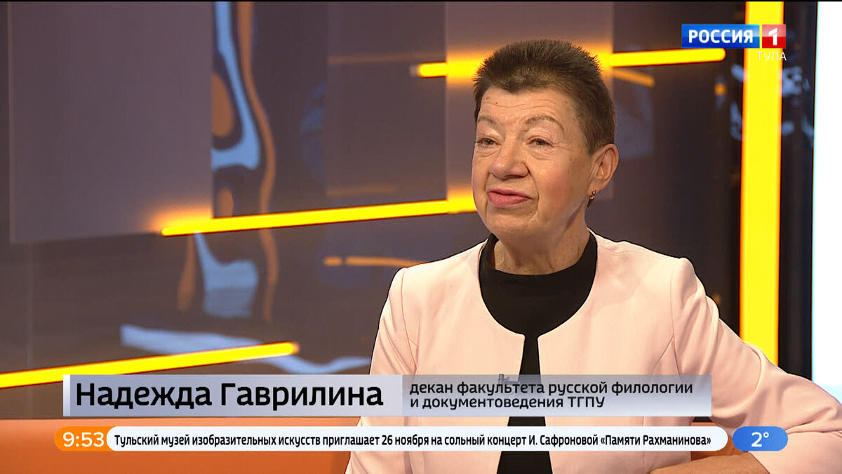 В педагогическом университете имени Льва Николаевича Толстого стартовала юбилейная неделя, посвящённая 85-летию факультета русской филологии и документоведения. Об истории и современности старейшего факультета в утренней студии тульских “Вестей” поговорим с деканом исторических наук, доктором исторических наук, деканом факультета русской филологии и документоведения Надеждой Гаврилиной. Факультет был первопроходцем во многих направлениях работы. В 1960 году на нашем факультете в университете были открыты “Толстовские чтения”. Сегодня они носят статус международных, и уже в XXI веке студенты нашего факультета вместе с преподавателями проводят международные Толстовские студенческие чтения. Мы никогда не забываем, что в 1990 году выпускник нашего факультета Александр Евгеньевич Сутормин стал Учителем года, и президент Российской Федерации вручал ему хрустального пеликана. И “Зелёная лампа” зажглась на факультете русского языка и литературы под руководством Татьяны Михайловны Макаровой. М