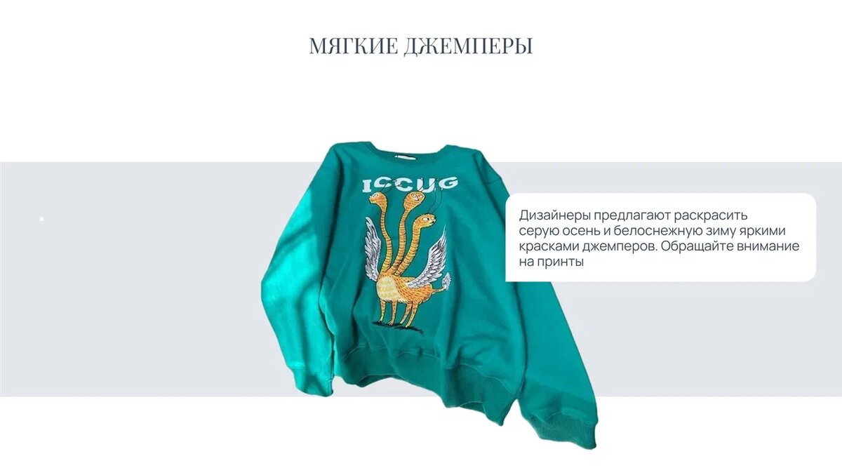В этом сезоне вновь отдайте предпочтение моделям оверсайз. Но не останавливайтесь на базовой пастельной палитре. Дизайнеры предлагают раскрасить серую осень и белоснежную зиму яркими красками джемперов. Обращайте внимание на принты. Чем интереснее, тем лучше. Этим же принципам руководствовались дизайнеры Gucci, создавая новую коллекцию джемперов.
