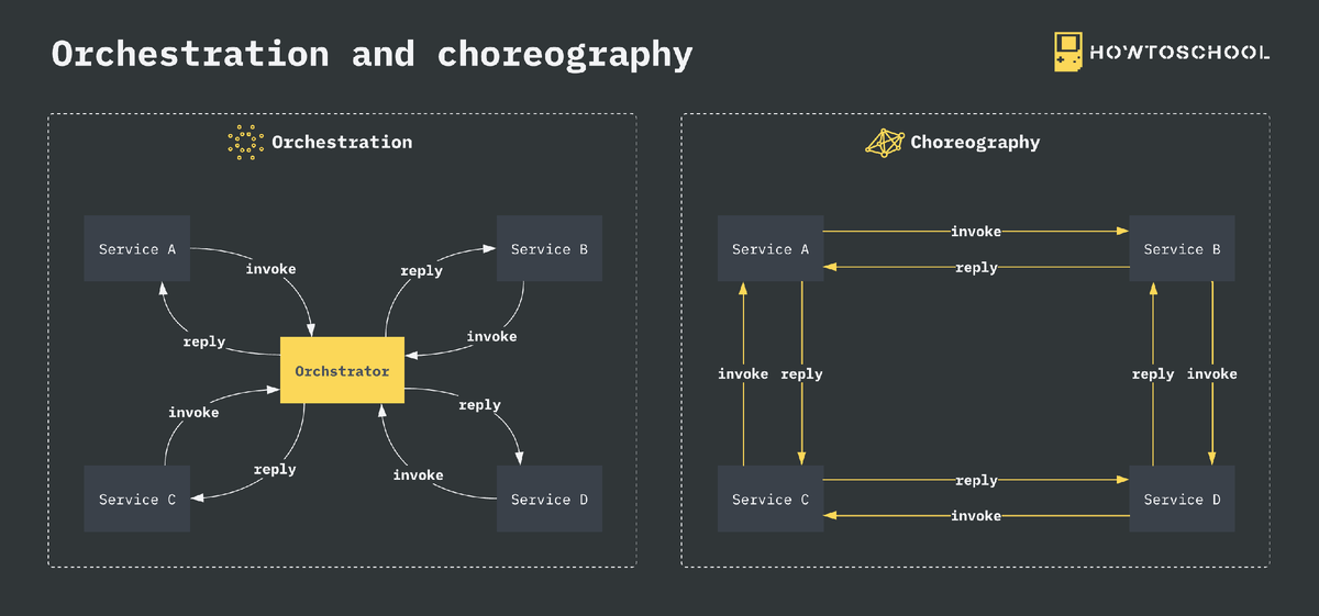 Есть два вида взаимодействия микросервисов друг с другом – оркестрация и хореография Оркестратор (Orchstrator) выступает в качестве распределительного центра. Он отвечает за взаимодействие и управление всеми запросами между различными сервисами. Тут как раз подходит аналогия дирижёра и оркестра. Хореография — это, как если бы хореограф установил все правила, а после танцоры (микросервисы) в соответствии с установленными правилами начали бы взаимодействовать на сцене без него. Хореография сервисов описывает этот обмен запросами и правила взаимодействия микросервисов. Преимущества оркестрации: Некоторые ограничения оркестрации: P.S. Был ли у вас опыт использования выше описанных подходов?