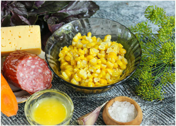 Шаг 1. С консервированной кукурузы слейте сок. Морковку очистите от верхнего слоя и помойте. С колбасы снимите натуральную оболочку. Шаг 2. Морковку натрите на крупной терке. Колбасу нарежьте соломкой. Шаг 3. Небольшой кусочек твердого сыра натрите на терке с крупными ячейками, добавьте стружку к другим продуктам в миске. Шаг 4. Пересыпьте кукурузу в салатницу Шаг 5. Выдавите в салат один зубчик чеснока через пресс, добавьте измельченную зелень, майонез, соль и перец по вкусу. Перемешайте и закуска готова. Приятного аппетита!