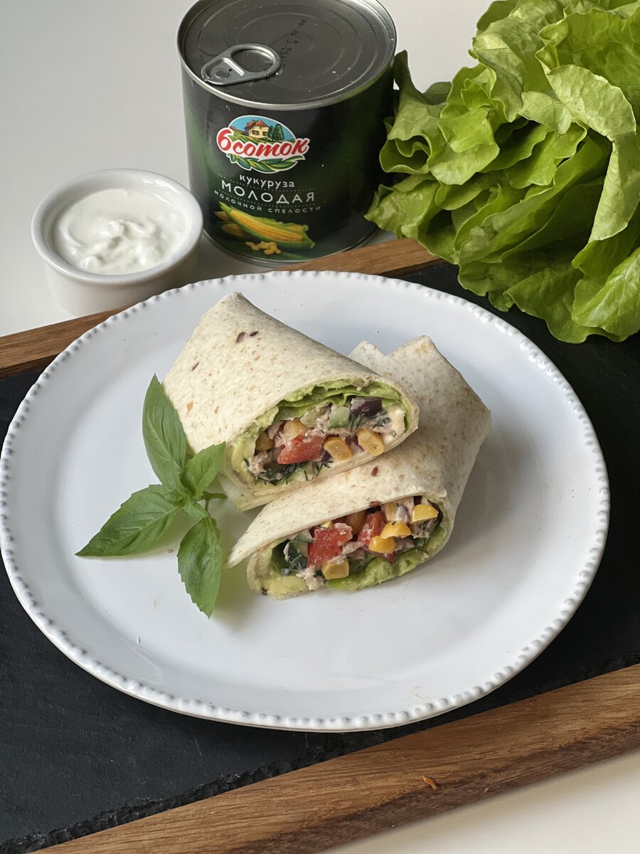 - На тортилью выкладываем гуакамоле и распределяем тонким слоем, далее кладем салатные листья, а сверху салат с тунцом и кукурузой. Сворачиваем все в рулет, разрезаем и подаем! Готово!