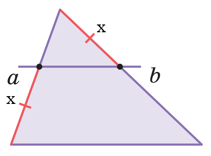 Задача: Длины двух сторон треугольника равны a и b. Прямая, параллельная его третьей стороне, отсекает на них равные отрезки так, как показано на рисунке. Найдите длину этих отрезков. ©Математическая Вертикаль. Учебное пособие для общеобразовательных организаций. Автор: М.А.Волчкевич. Решение: Обозначим равные отрезки за x. По теореме о пропорциональных отрезках x/(a-x) = (b-x)/x. Решим данное уравнение: x/(a-x) = (b-x)/x x^2 = (a-x)(b-x) x^2 = ab - ax - bx +x^2 ab - x(a+b) = 0 x(a+b) = ab x = ab/(a+b) Ответ: ab/(a+b). Задача решена.