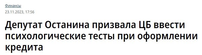 Глава комитета Госдумы по делам семьи, депутат от КПРФ Нина Останина обратилась к главе ЦБ Эльвире Набиуллиной с призывом ввести обязательные психологические тесты для заемщиков, обращающихся в кредитные учреждения за кредитом или займом. По мнению депутата, такое нововведение помогло бы бороться с мошенниками, которые внушают доверчивым россиянам необходимость оформления кредита для дальнейшего перевода по предложенным реквизитам. А если потенциальный заемщик провалил тест, то его следует направлять к специальному уполномоченному психологу - считает Останина. Вот цитата: Защитой для населения нашей страны могло бы стать обязательное или добровольное психологическое тестирование при оформлении кредита в банке. А в случае неудовлетворительных результатов такого тестирования, обращение к уполномоченному банком психологу за консультацией. Я просто представляю себе, как человек приходит в банк, говорит: "хочу взять кредит на ремонт квартиры", а там ему в ответ: "Так-так, успокойтесь, приса