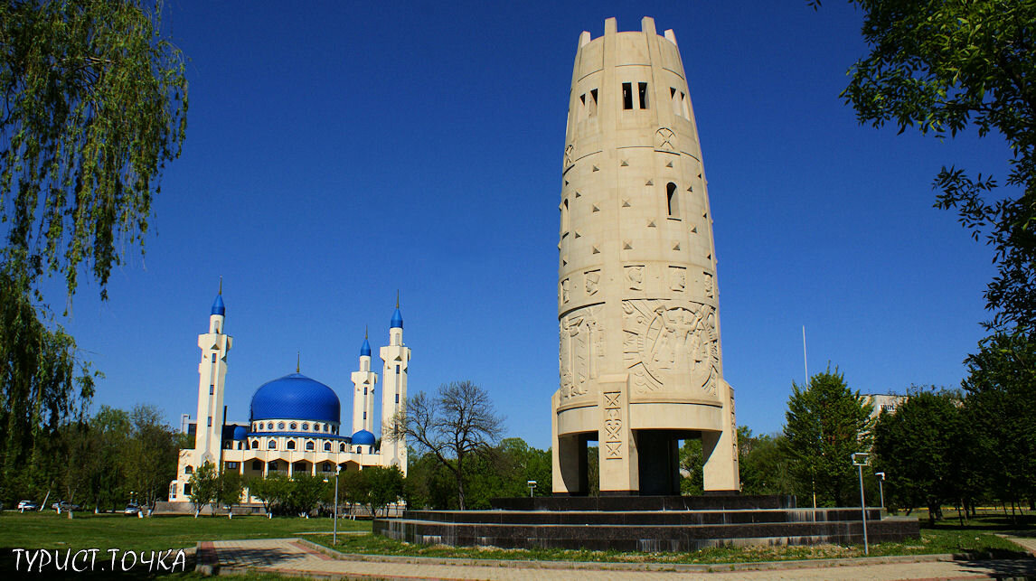 В центре Майкопа стоит высокая башня, сплошь покрытая барельефами с изображениями мифологических и исторических сцен из истории Адыгеи. Это – монумент «Единение и согласие» или, как чаще его называют – «Очаг». Очень необычный памятник. При чём тут очаг и почему он в виде башни? Название «Очаг» дано потому, что монумент по форме напоминает национальный адыгский (черкесский) очаг, имеющий дымоход в виде высокой башни. Очаг – слово тюркского происхождения, означающее место для разведения и поддержания огня. Однако слово это имеет в адыгской культуре более широкое значение, не только как печь, но и как сакральный элемент. Впрочем, как и у других народов. В исторической терминологии даже есть такое понятие как «очажная культура» – период в развитии многих народов. У адыгов был настоящий культ очага, и с ним было связано много обрядов. Ежегодно раз в год из очага стреляли в небо, чтобы отпугнуть от дома злых духов, которые могли проникнуть в жилище через дымоход. Но также очаг у многих народ