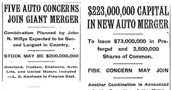 Читатели выпуска «Нью-Йорк Таймс» от 4 июня 1916 года, несомненно, были шокированы сенсационным заголовком: «ПЯТЬ АВТОКОНЦЕРНОВ ГОТОВЯИСЯ К ГИГАНТСКОМУ СЛИЯНИЮ». Эта новая автомобильная компания должна была стать одной из крупнейших когда-либо созданных, объединив Willys-Overland, Chalmers, Hudson, Electric Auto-Lite и United Motors. Их совокупный рыночный капитал, оценивался более чем в 220 миллионов долларов. В последующих выпусках "Times" появилась дополнительная информация о предполагаемом слиянии. Трое бизнесменов, возглавлявших эти предприятие, были: Уиллис, торговец и производитель велосипедов из штата Нью-Йорк, в 1907 году взял на себя управление обанкротившейся компанией Overland Automobile Co. в Индианаполисе и успешно преобразовал ее в Willys-Overland и перевез ее в Толедо, которая к 1912 году стала вторым по величине автопроизводителем страны. Все это время Уиллис удерживал контрольный пакет акций компании, которые, по некоторым оценкам, стоили около 90 миллионов долларов.
